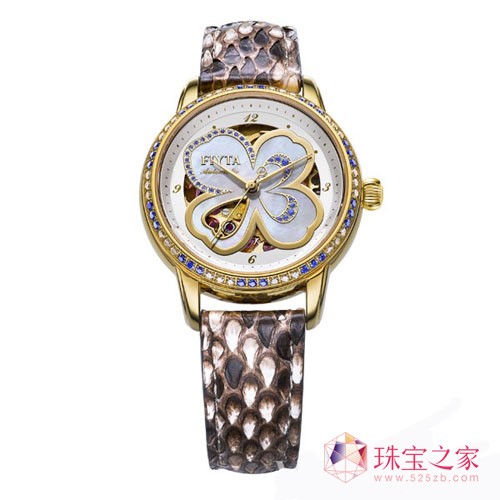 在传说中,四叶草的四片叶瓣,分别代表着:真爱、健康、名誉、财富;找到了“四叶草”,就拥有了幸福。蛇年伊始,让这个有关幸福的梦,在腕上悄然绽放。飞亚达“四叶草”女士腕表蛇年限量款全新上市,全球限量1000枚。腕表采用了镂空设计,以天然贝母、锆石簇拥成一朵四叶草。随着光线和角度的变幻,贝母会呈现出不同的光影,如海上云霞般梦幻;透过表盘镂空的叶瓣,可欣赏机芯律动之美,一如生活里的摄影师,时刻以欣赏的眼光看待世界。优雅的南瓜形表冠,是细赏后的小小惊喜,与那恰到好处的复古玫瑰金色,在时间中流逸成岚中蜃景,醉了人,醉了不停歇的时光。腕表底盖复刻了相机镜头元素,将时光里的风景典藏“芯”底。蛇年来临,设计师特意选用蛇皮作为腕表的表带,平添一份性感和灵动,让美感绽放腕间。