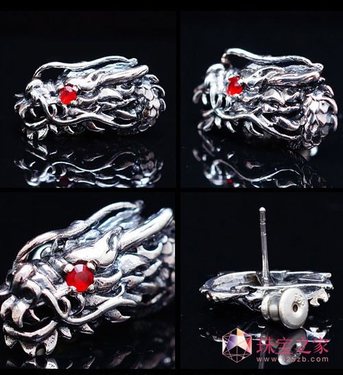 这一款男士首饰是以象征权利和高贵的中国龙为形象设计的,银饰表面刻了龙的花纹,耳钉的龙眼和指环上两条龙中间都镶嵌了宝石。不奢华,也不单调。