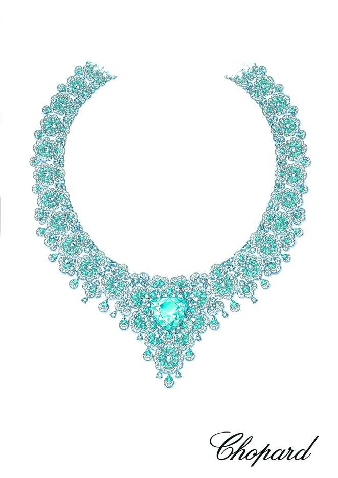卡罗琳•舍费尔(Caroline Scheufele)对珍罕宝石充满热忱,怀着对神圣地球家园的敬畏之心,她从全球的四个角落觅得奇珍异石。这些来自珍贵宝石家族的成员包含一颗重达21.04克拉且未经热处理的蓝宝石,一颗梨形切割且未经热处理的鸽血红宝石,或一系列哥伦比亚祖母绿,其中最大的那颗祖母绿重量不低于61.79克拉。这颗巨大祖母绿将成为钻石项链的点睛之笔,此项链将与一对分别镶嵌两颗31.16克拉和39.80克拉祖母绿的耳环配套成组。所有这些宝石几乎不含杂质,对于这类克拉数大的宝石而言极其珍贵。