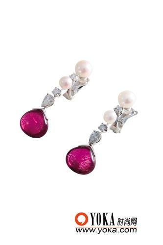 彩宝的设计似乎都偏爱水滴形状,也许只有这样才能表现其晶透的一面,化作耳饰摇溢于耳边,犹如被晨风吹落的露水。