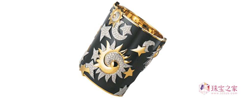 重量为413.7克的单片黄金,包裹住精工制作的蓝色珐琅;在这珍贵的闪耀着黄色和白色星星的"穹顶"上,点缀有659颗钻石,共计25.10克拉。每颗星星都是单独制成,用一种复杂的螺旋方式固定在该款手镯之上。