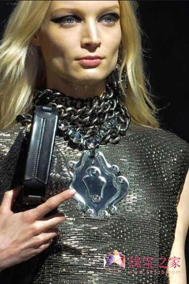 2012的秋冬时装周,小清新的配饰不再吃香,譬如老佛爷Karl,用盔甲般厚重的犹如“锁喉圈”的金属项圈,配合特制的水晶石眉贴,使得穿着厚呢大衣的模特们一出场就显露锋芒。阿玛尼先生则偏爱现代感强烈的亚克力材质,椭圆、三角、方形等独立的几何体串成项链,让天鹅绒套装格外有看头。Lanvin的设计师Alber Elbaz竟然也是个重口味,粗犷的链条糅合瑰丽的宝石,再混搭风格迥异的大象、狮子、红唇等金属制成的造型,衬在塑形感强烈的锦缎连衣裙上,华丽与狂野并存。只要够大胆,管他浮夸不浮夸,配饰也能戴出四两拨千斤的效果,这就是重口味配饰。