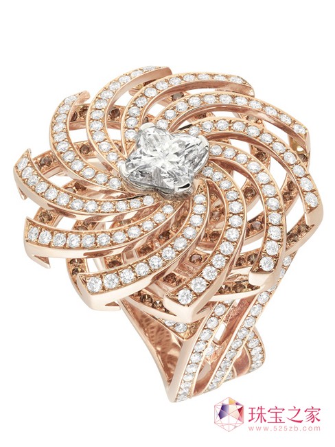 Dentelle De Monogram“钻石蕾丝”主题精致动人,以别出心裁的概念演绎LOUIS VUITTON的 Monogram花卉图案,其中一款“小飞侠”(Peter Pan)圆领形颈圈散发维多利亚时期风格, 与Marc Jacobs的时装设计细节呼应;颈圈造工细緻,虽然镶嵌着玫瑰切割古董钻石及古董圆钻,其前幅的扣子灵感源自LOUIS VUITTON行李箱扣,仍不失灵活柔软,如同第二层皮肤; 而胸针及手镯设计同样惊艳––其中一款阔身胸针饰于胸前,形如“美好年代”服饰的前襟;而戒指以钻石蕾丝托起一颗灰蓝色尖晶石,散发神秘魅力。Monogram Infini大项链凝聚品牌的美学精华及珠宝工匠的非凡工艺:螺旋形镶嵌的白钻及钻形如费氏数列,融汇着科学及自然的奥秘;散发第一帝国时期风格的玫瑰金圆章镶嵌一颗3.82克拉LOUIS VUITTON花卉形钻石;日本Akoya珍珠及琢面钻石珠粒链串,绽放悦目光华。