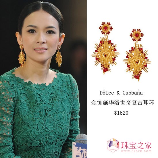 章子怡身着一袭绿色的蕾丝裙显得贵气十足,金色的夸张大耳环是今年最流行的民族风,金色高贵豪放,点缀上红色的水晶则增添异域风情。