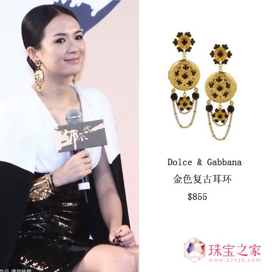 黑白色的夸张大斗篷让章子怡变得强势不少。一款圆型的夸张型耳环很好的呼应了她服装的霸气,金色配黑色加上繁复的花纹为简单的黑白色服装增色不少。