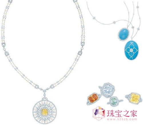 蒂芙尼铂金镶嵌黄白钻雏菊装饰吊坠&绿松石和钻石吊坠项链&“Colors of Wonder”戒指