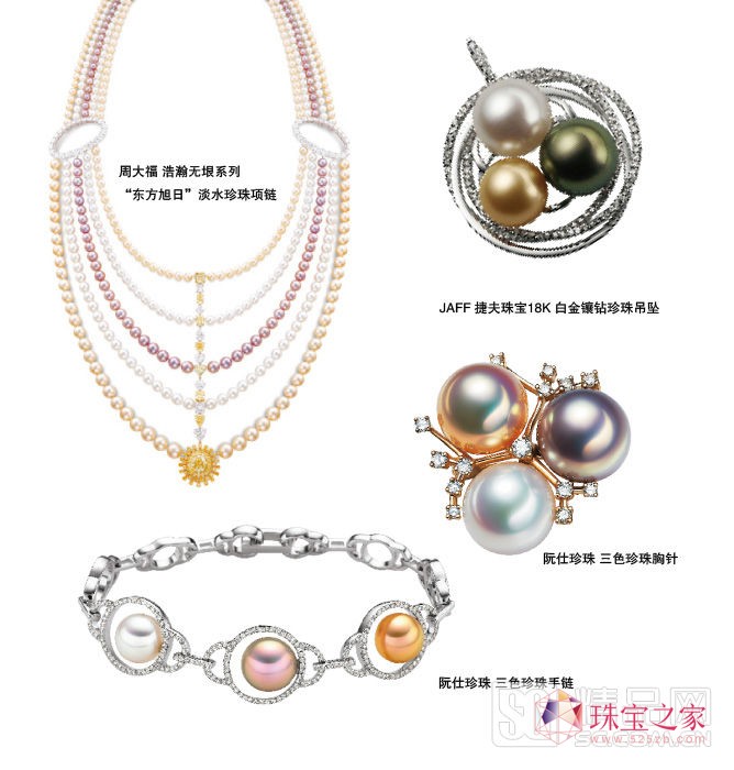 金色、白色、粉色珍珠的巧妙搭配,柔和的色泽让整款项链看上去充满女性的温婉气质,多层次的串联以及与钻石的搭配,让这款项链看上去极为奢华。