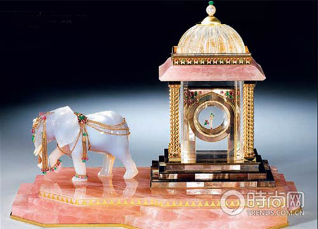 约1990年生产的神秘座钟,高26厘米,宽35厘米,机芯编号81001S/001,外壳编号640997。手动钥匙上弦机芯装于阶梯形黑色珠母贝亭阁底座上,水晶石表盘搭配黄金镶钻表圈。亭阁有4 个扭条金圆柱,承托着凹槽形玫瑰石英亭顶,由水晶石凹槽圆顶承托,盖以金、珍珠和雕刻绿宝石,圆顶边缘饰有镶钻石、红宝石和绿宝石的金栏杆,亭阁的一边是一头行走中的大象,亭阁和大象置于玫瑰石英和金制的底座上。钻石总重约9克拉。估价: 1500000——2500000 港币,成交价:5800000(含佣),附带原厂盒及上弦钥匙。