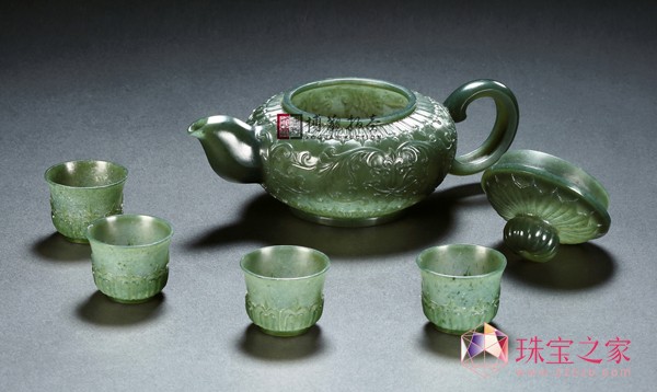 青玉薄胎茶具,一套五件由一块玉料所作,颜色均匀