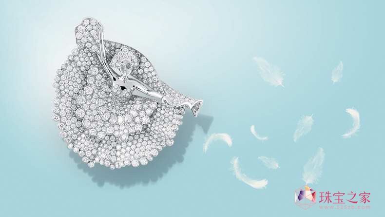 钻石舞者装饰胸针,Bals de Légende网传奇舞会高级珠宝系列,2011年珠宝与舞蹈总给人以相似的情感体验:追求完美、精确细致、以及令人兴奋的眼花神迷。路易•雅宝(Louis Arpels)经常前往位于芳登广场办公室四周的巴黎歌剧院(Opéra Garnier)欣赏芭蕾,Van Cleef & Arpels梵克雅宝对这项富有诗意的表演艺术的钟爱也始自于此。