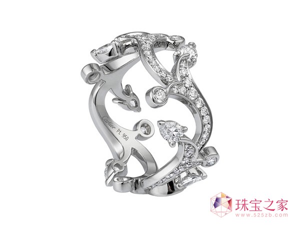 钻石环绕,化为花朵缱绻交织??这就是18K白金结婚对戒,清新的青春气息,如同一缕编绣着花卉的蕾丝,单颗钻石镶嵌、圆形明亮式切割钻石铺镶与花式梨形切割钻石交错纷呈。卡地亚珠宝技艺巧夺天工,戒指上盛开出似锦繁花,闪耀浪漫的柔美之光,令品牌的花环风格绽放出魅力永恒的初蕾。
