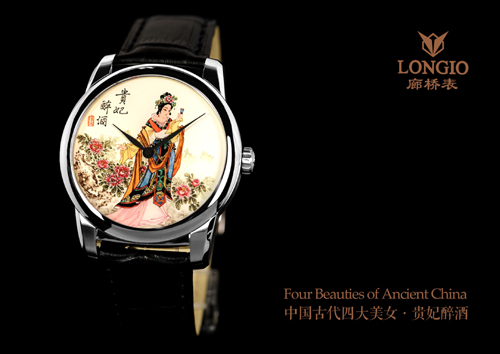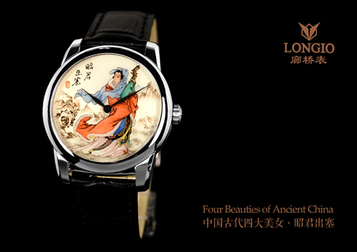 LONGIO廊桥-Four Beauties of Ancient China四大美女系列完全融合了中国古典优雅含蓄之美和顶级的内画工艺,在作画时,时而细笔游龙,勾勒人物的轮廓线条;时而浅色细着,美女的粉脸香腮跃然表盘;时而泼墨如云浓淡有致,美女的紧身小袄,宽松罗裙挥笔而就。搭配抛光不锈钢外壳及ETA2824自动机芯,将乌发蝉鬓、娥眉青黛、明眸流盼、朱唇皓齿的四大美女静静圈置于蓝宝石表盘之下,方寸之内,笑语盈盈暗香去。让我们见证爱的奇迹,众里寻他千百度,蓦然回首,那人却在,火阑珊处。