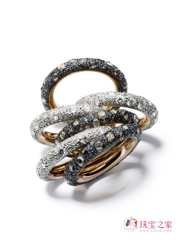 由椭圆形链环组成的玫瑰金手链上密实铺镶着褐色或白色钻石。品牌将相传于十八世纪的古老镶嵌技艺加以创新改良,在暗哑打磨或镀铑质地的贵金属上将珍稀美钻以不规则的形式铺砌,彰显其壮丽辉煌与匠艺独具之特质。若想以一款令人难忘的珠宝庆祝人生中那些最重要的时刻,Tango则毫无疑问成为绝佳之选。
