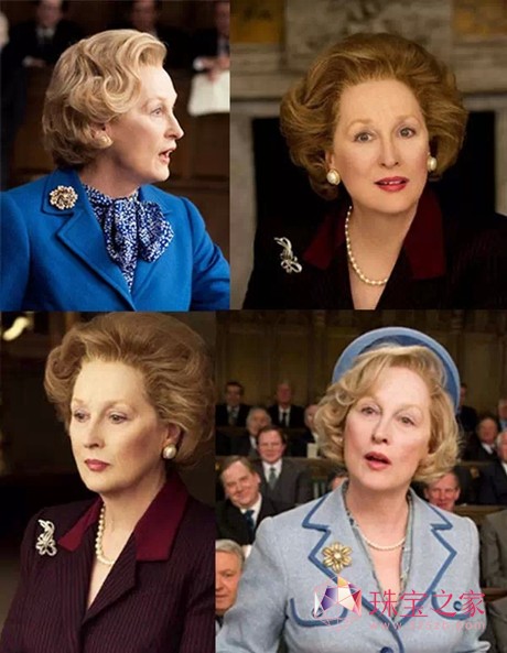 如果不是芭珠姐放在一起,你可能根本想不到这个角色竟然也是梅丽尔•斯特里普~~在传记电影《铁娘子》梅丽尔?斯特里普演绎撒切尔夫人时,原样复刻了撒切尔夫人对珠宝的选择:圆形珍珠耳环、珍珠项链等标志性元素。