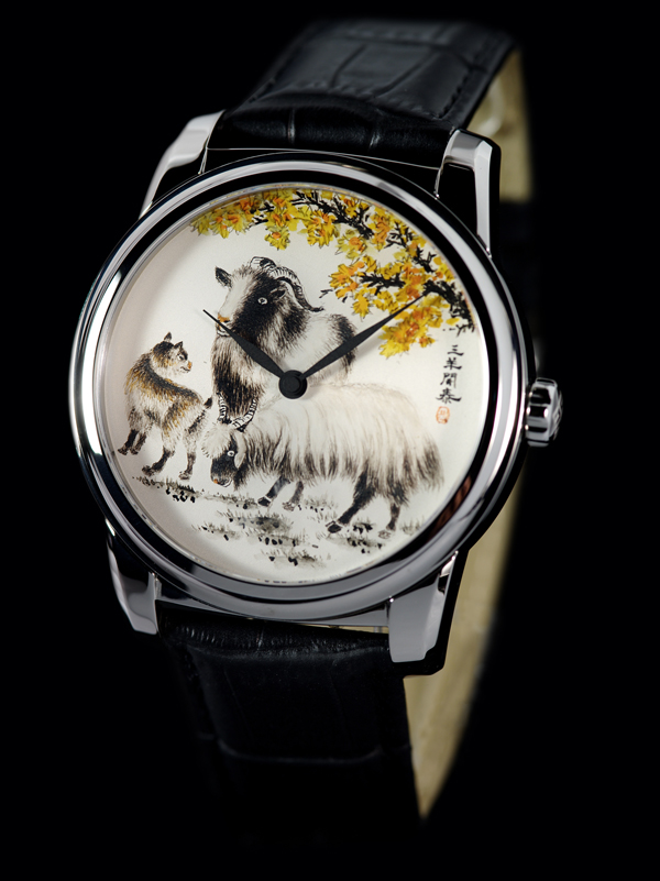 冬去春来,阴消阳长,内健外顺,是为君子道长而小人道消,乃吉亨之象,常用以称颂岁首或寓意吉祥,米长虹先生以此为象,在2015金羊年新春初临之际,推出“米长虹时间艺术•雅颂系列之三羊开泰”腕表。“雅颂-三羊开泰” 腕表特取汉族特有之传统吉祥语和吉祥图案,采用非物质文化遗产镜向反绘(内画)工艺,通过中国传统工笔绘画技法,于精美的蓝宝石玻璃表盘反向绘制,为您送来金羊年的新春祝福。
