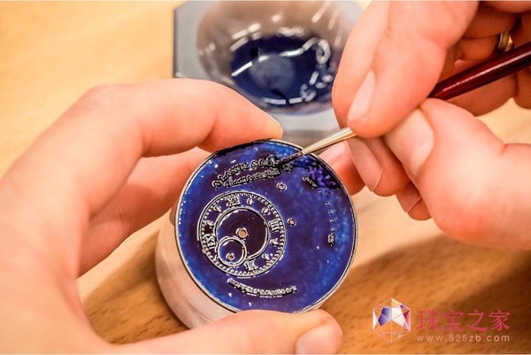 珐琅层愈多,表盘成品表面颜色就愈深。因此,原本闪着点点蓝光的珐琅颗粒,最终形成黑色的表盘。