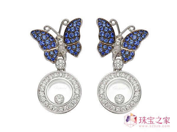 萧邦以飞舞的蝴蝶与皇冠为造型,打造出全新的项链、耳环与腕表产品。 其扣人心弦的外观设计,加上精巧细腻的制作工艺,营造出柔美动人的女性气质。 以浮雕形式呈现的蝴蝶,周身铺镶蓝宝石和钻石,停靠在Happy Diamonds Butterflies的耳环与项链上休憩。