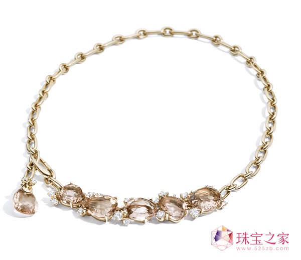 摩根石,又作“铯绿柱石”,被誉为彩色宝石中的“轻奢新贵”。钟情于彩色宝石的多情美丽,宝曼兰朵以摩根石为主石材的珠宝推陈出新。大小不一的摩根石于玫瑰金项链之上错落排列,娇柔莹润。宝石均采用不规则切工,每一次切割的角度均精心设计,恰到好处,使光线得以最佳反射效果。可随心确定位置的搭扣设计丰富了佩戴的多样性,尾部坠起的一颗宝石如跳跃摆荡的心,率性而妩媚。自不同角度观察,珍贵摩根石呈现出精致微妙的色彩变幻,水漾光泽加以钻石星光般的璀璨映耀,令每个女人都拥有媲美好莱坞明星的曼妙魅力。清爽的海蓝宝则以白金镶嵌,灿如阳光的金绿柱石以黄金相配,点缀着褐钻的低调奢华。
