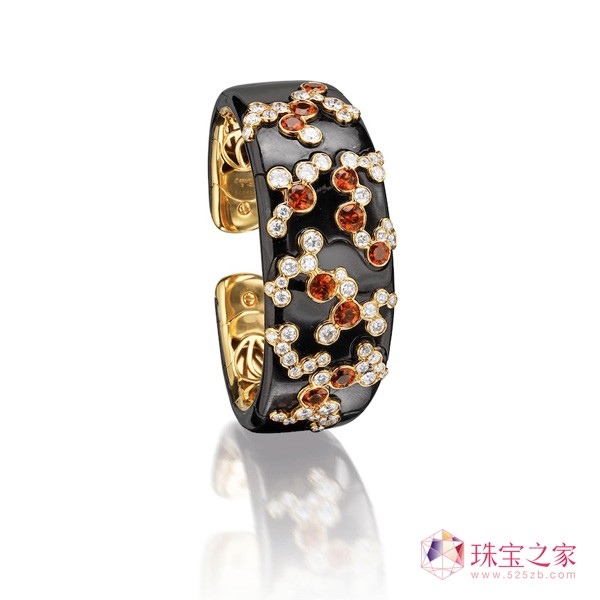 另一个展现 Marina B 独特风格的绝佳作品就是这件铰鍊式手镯,反映了她从日本文化和樱花盛开中所获得的灵感。手镯配有切工精湛的钻石,环切的橙刚玉似盛开的樱花一般凸显了手镯的美丽。估价:港币 140,000-200,000;美元 18,000 - 25,800;英镑 10,900 - 15,600