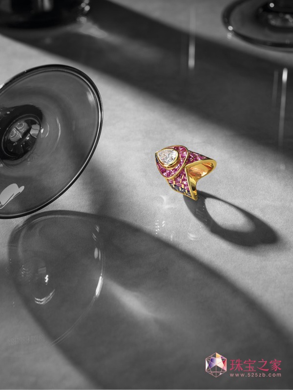 这隻无与伦比的戒指结合了Marina B 的创意风格,在华丽和抽象镶嵌背景下使用了硕大、优质和珍贵的宝石。这颗天然缅甸红宝石重10.54克拉,旁边镶有榄尖形切割和方形切割的钻石。