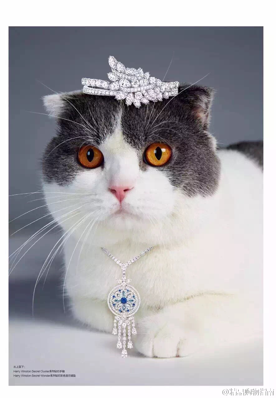 最近,《精品购物指南》请来了6只萌态十足的喵星人来为杂志演绎一组奢华珠宝大片,其中一只灰米喵佩戴Graff钻石项链和《蒂凡尼的早餐》中的赫本神“撞脸”。这只灰喵的眼神凛冽,透着一丝杀气,霸气十足。但是其它五只喵却使尽了浑身的卖萌招数,十足逗趣,戴上奢华无比的配饰,一只只又好似高冷贵妇。