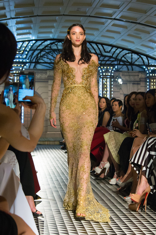 现场的光线射落在金黄色一字肩的直身裙上,令浅黄水晶机切平底石VIVA12®独有的12切面光芒更为璀璨,将Golden Era的面貌现于观众眼前。