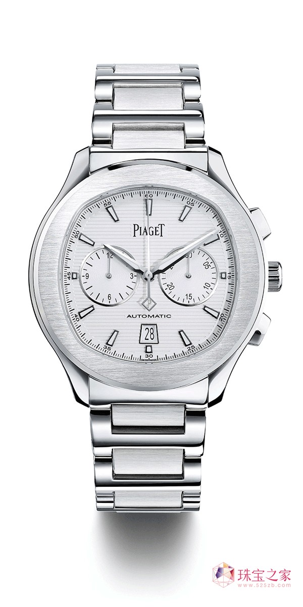 搭载Piaget伯爵制1160P自动上链机械计时机芯 (时、分,日期显示设于6时位置,中央计时秒针,30分钟计时盘置于3时位置及12小时显示盘置于9时位置)