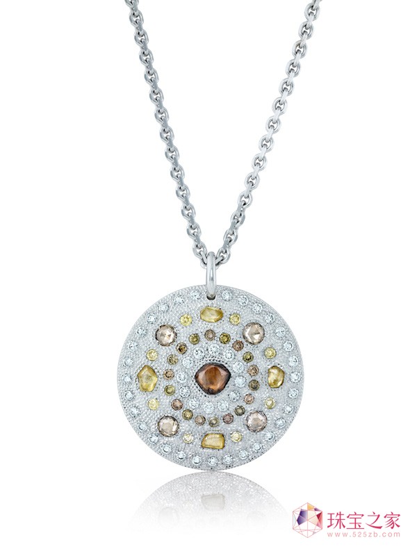 78 颗精选白色和炫彩天然原钻及抛光钻石,在工艺精美的 18K 白金链坠上散发出永恒的魅力。总克拉数:3.78。DE BEERS独有的SERTI POINCON(标志性)底座。链坠直径:30 mm;链长 45 cm,在 42 cm 处有调整环。