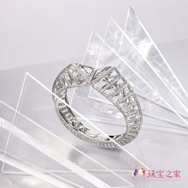 耀眼光线穿梭于这枚手镯的扭转曲线之间。天然水晶与镂空镶嵌的两颗圆锥形钻石相互映衬。光芒在利落分明的造型和富有韵律的图案中连绵辉映。