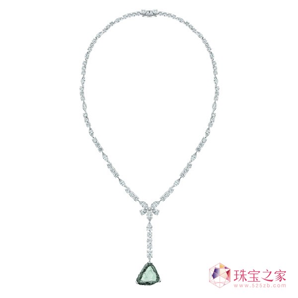 莲花的故事,从它的花瓣跃过水面逐渐绽放开始。纯洁的莲花在影子之中渐渐舒展,滴从它的花瓣上滑落,留下一圈轻微的涟漪。这个纯净的瞬间属于初放莲花,它吸引着我们的眼光,沿着圆形和马眼形钻石所组成的行云流水般的钻石线条往下看,垂坠于项链下的18.79克拉蓝绿色三角形天然原钻呈现于眼前。