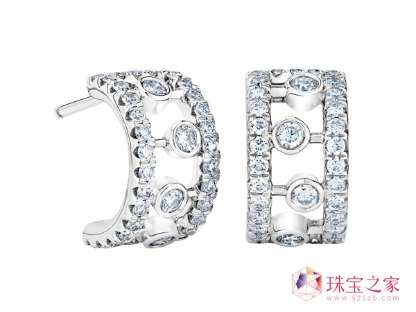 灵感来源于清晨的阳光中闪耀的晶莹露珠,昭示着希望和美好的新起点。环状白金耳环镶嵌80颗美钻,共0.72克拉。