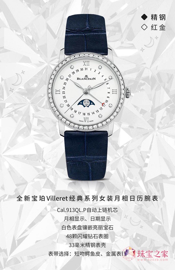 全新宝珀Villeret经典系列女装月相日历腕表精钢款