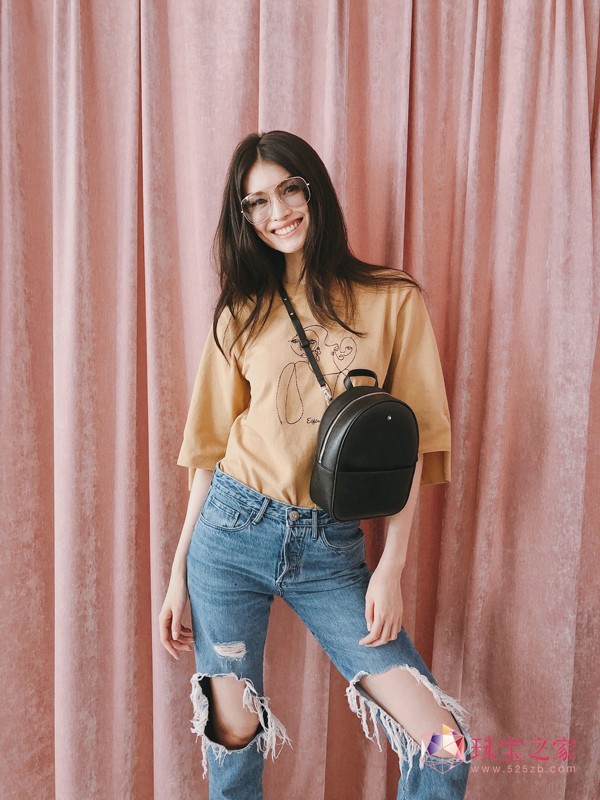 超模何穗将万宝龙X包先生联名胶囊系列女士双肩包单肩斜挎于身前,破洞牛仔裤与精美皮革搭配碰撞,轻松展现拥有超强气势的年轻前卫穿搭。