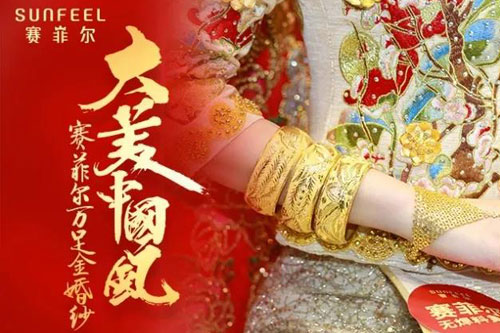 自2014年以来,赛菲尔珠宝一直致力于为最美新娘们打造最美万足金婚纱,已成功推出5公斤、8.5公斤、9.999公斤和多款“大美中国风”万足金新品婚纱。6年来不断寻求创新与突破,集结近百位顶级匠师智慧,将中国传统婚礼文化与传承千年的黄金文化完美结合,以巧夺天工的工艺打造令人叹为观止的无焊料黄金婚嫁首饰。