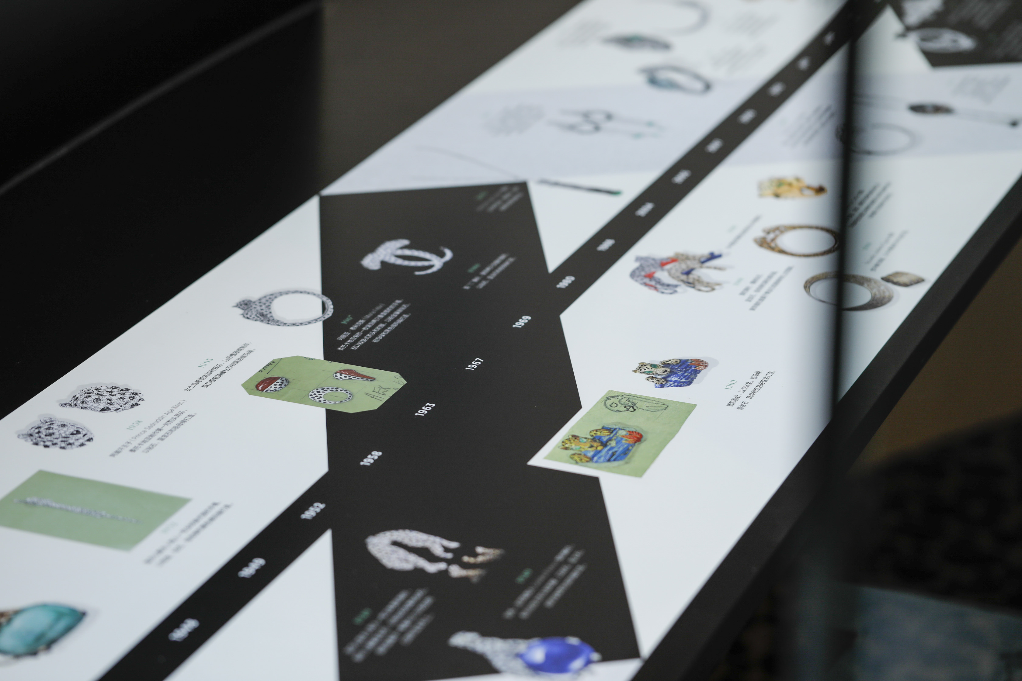 卡地亚将展馆分为三个主要展区:“非凡设计”单元陈设一张珠宝设计师工作台,展示臻美作品;“历史沙龙”单元展示珍贵照片,追忆猎豹女士贞·杜桑(Jeanne Toussaint);“名流社区”单元以数码墙的形式展现古往今来精彩演绎桀骜不羁的Panthère猎豹精神的名人风采。