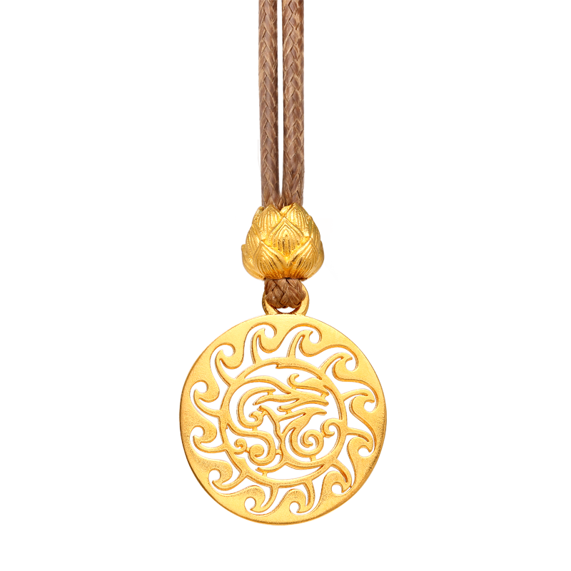 灵感来源于电影《哪吒之魔童降世》中李靖服饰上的太阳图腾纹样,是生命力、活力、精力、力量和领导能力的代表。此款首饰主要运用古法金工艺并与传统纹样相结合,打造富有尊严、勇气、创造力与知识的冰火项链,诠释出大放光明,鸿运当头的吉祥祝福。