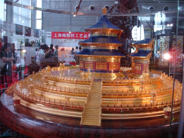 在深圳举办的第四届文博会展馆内陈列的珠宝“天坛祈年殿”,历经四年,耗用白银一百二十八千克,钻石、宝石二十余万粒制作完成的稀世珍宝,祈年殿内部则艺术的再现天子祭天的场面以及辉煌的装饰。现场观看的市民纷纷掏出相机将祈年殿拍摄下来。