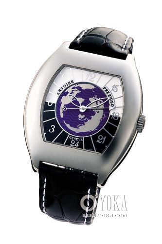 安东尼-裴修素的环游世界(Transworld)手表。24小时刻度盘,独特的3小时间隔显示,白昼与黑夜被清晰地体现在手表盘面上。均匀有力的时间刻度被独具匠心地用作世界地图的经度线。完整、形象的“地球村”被精妙地展示在手腕之间。