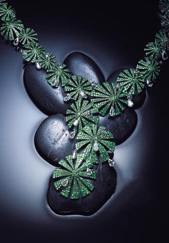 萧邦一直是著名影星们在红地毯上钟情的品牌,这条项链有着如清晨荷叶般的造型,翠绿的宝石组合成碧绿的叶子,项链上点缀着圆形和水滴型的钻石,犹如清晨荷叶上的露珠。