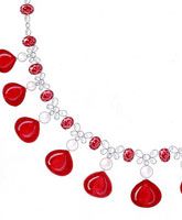 Van Cleef & Arpels梵克雅宝将一颗颗深红宝石,串成极致华丽的Théodora珠宝系列。此款项链将十一颗半梨形的红色电气石珠,编织成珍贵细致的宝石花边,仿如魔法般地悬挂在嵌以钻石和白k金的珍珠链条下。激情洋溢的Théodora系列还有与此款项链配套的耳环,深红电气石珠与光芒四射的钻石使得迷人的Théodora耳环更显细致与矜贵。(仅限发行1套)