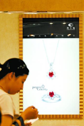 周大福郑州专柜昨天下午接到上级通知,要求撤换镶嵌红宝石和蓝宝石的部分饰品