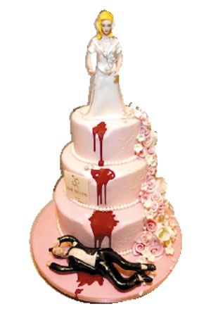 离婚蛋糕的作法跟结婚蛋糕差不多,但常被要求特殊造型,像是先把新郎锯成两半,最后再塞到蛋糕下面压扁,就可以达成泄恨的功能,还有新娘从蛋糕顶层一脚将新郎踹到底层的造型,相当幽默有趣。