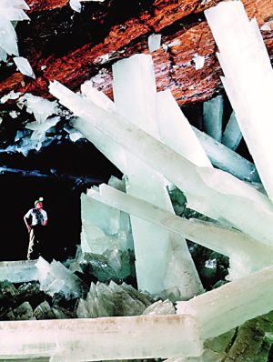2000年发现的这个巨型水晶洞是一个宽10米长30米的马蹄形石灰岩溶洞。巨大的水晶柱从洞穴的上面和四面突出来。加西亚-鲁伊斯说:“世界上没有哪个地方的矿物世界能有如此的漂亮了。”