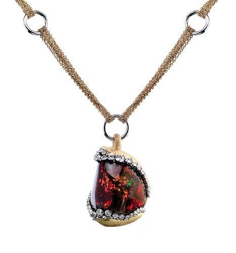 整场展卖中,曾获设计界极具权威的乔治与雅克·阑芳奖(le prix Georges et Jacques Lenfant)的布鲁诺·巴勒松是展览中带来作品最多的一位设计师。橱窗里摆放了20多件设计师的代表作品,一款中国山水画风格的枝晶石项链分外惹眼。“我在巴西找到很多枝晶石,这种石头最大的特点是图案不会重复,不可能有两块枝晶石的图案是一模一样的,”布鲁诺从他工作室里的两株兰花垂下的花穗中得到了灵感,“我非常喜欢中国的山水画,中国山水画的背景是模糊的,但画面上花、草、树木和小桥的图案都很细致。恰好这块枝晶石的底色朦胧、花纹细腻。所以我保留了整块长方形的枝晶石,再用丝丝缕缕的钻石流苏来衬托,宛如一幅长卷的中国山水画。”对布鲁诺来说,当他创作一件宝石作品时,很重要的一点是诠释某种文化。这件名为“千丝万缕”的项链作品设计精妙,镶嵌在枝晶石上的白金流苏就像兰花垂下的花穗,这也是整件作品中工艺最复杂的部分——既要将镶有1.7克拉黑钻和0.50克拉白钻的白金流苏裹在石头上,又不能丝毫破坏枝晶石表面的光泽和图案,同时还要保持流苏的自然垂感。整条项链上则嵌有51.7克拉的黑钻,用来呼应整条项链庄重、沉郁的色调。