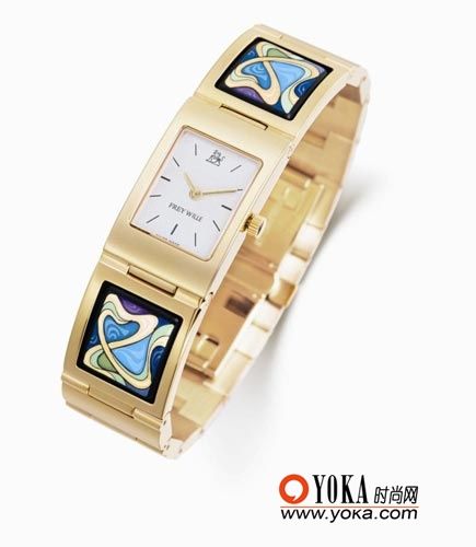 在FREY WILLE的产品世界中,除了传统的圆形与矩形表盘,设计师还创新开发出3种不同的表盘形状:优雅的细长型手表以香槟或银色调的表盘让人追忆起古老的Cartier珠宝风尚,手镯上与众不同的珐琅与黄金装饰更让你惊叹这不仅是一件精良的计时钟表。