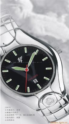 2.扣压式防水手表。它的后盖里面有一圈高凸的子口,使上表壳和后盖能紧密地扣压起来。表玻璃和螺旋式防水手表同样是用工具轧压进去的,比较严密。上条柄头里以及上壳与后盖接触的部位也放有防水垫圈。开启这种防水手表的后盖,是用刀撬的,关后盖也用轧具扣压或用手指推掀。