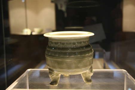 海外回流厅中,出自宋代五大名窑--定窑的一件刻花盖罐极为引人注目,此罐白瓷胎,施白色透明釉,器身对称两条盛开的莲花,纹饰清晰疏朗,线条圆浑有力,釉白而细润,极具风格,莲乃升之意境,与塔之多级向上融为一体,充分显示出宋代定窑刻花技术的精湛。宋代定窑的盘碗最为多见,仅次造型的罐目前所见仅此一件,国家博物馆藏有一件类似的盖罐,但不是刻莲花,是刻莲瓣纹,寓意相同。故而此罐弥足珍贵,堪为一件殊为难得的宋代定窑官制作品。