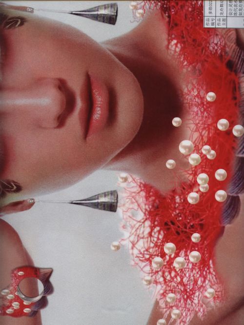 设计灵感源于中国民间的赛龙舟,红色纤维和珍珠代表水浪,耳环是一双浆,在佩戴中的动感犹如龙舟赛中奋力前进。佩戴者即为龙舟,象征年轻人热情与奔放,超越自我,让心飞翔。作品试图打破传统设计中套件首饰同一元素排列组合的方法,采用内在关联,外关完全不同的造型设计。作品不是一种凝固的造型,而是一件活动的雕塑,在佩戴中才能完成全部。