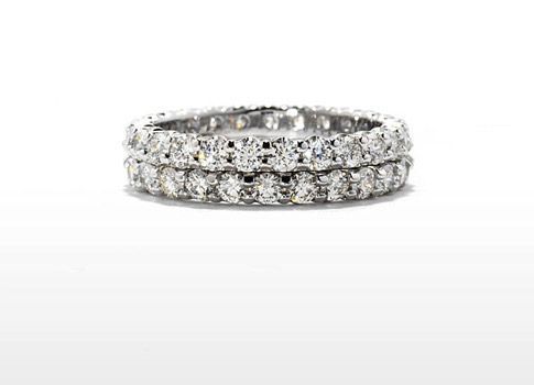 在白金的指环上铺满了细小的碎钻,以至于看不到金属指环,此款钻戒镶嵌工艺很高,所以很有品质,也十分典雅而有气派却没有怪异感。今年碎钻铺底的密嵌婚戒再次流行,无论黄金的还是白金的,都值得购买。