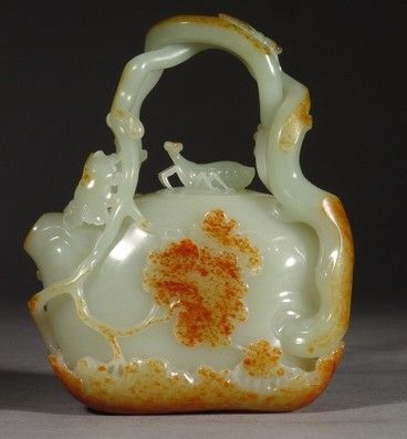 利用和田玉皮色巧雕的作品《秋意提梁壶》